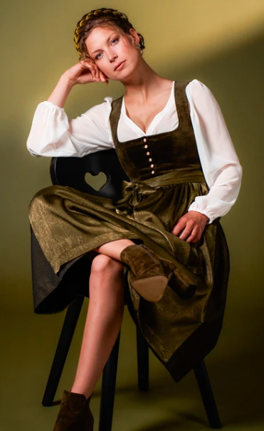 The Marjo Velvet Dirndl is the best choice for anyone wanting to combine a graceful look with the top fashion trends of 2026. Velvet has made a massive comeback by providing a rich, matte texture that looks sophisticated. The deep forest green bodice offers a structured, flattering fit that feels more like a high-end gown. It’s a statement piece, making it ideal for those slightly cooler September evenings.