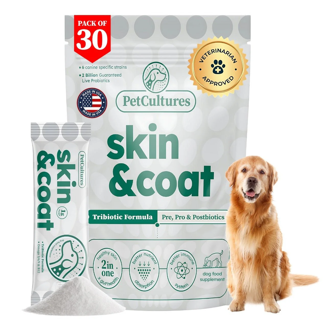 Petcultures skin formula is a blend of tribioics. It saves the good bacteria of the dog's body and improves the digestive system. It also reduces the inflammation, which makes the dog's skin shiny and healthier.