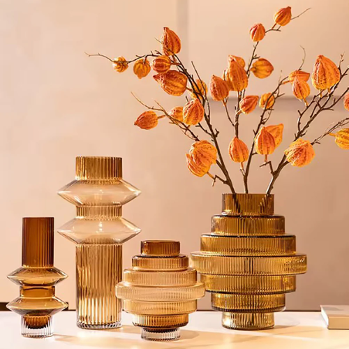 This wide-profile glass vase is cast in a rich amber tone, layered with a subtle ribbed texture that catches and softens light beautifully. You can use it either as a functional vase for fresh stems or as a sculptural object on its own.